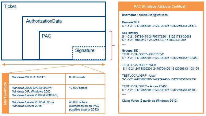 Les informations d’appartenance à un groupe utilisées pour créer un jeton d’accès sont envoyées chiffrées dans un ticket Kerberos. La partie du ticket Kerberos utilisée pour stocker ces informations d’appartenance au groupe est appelée le Privilege Attribute Certificate (PAC). Pour en savoir plus sur le PAC, vous pouvez consulter cet article ou [MS-PAC] pour connaitre la structure complète du PAC.