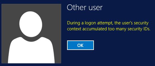 Attention: Le champ qui contient les SID des appartenances au groupe dans le jeton d’accès peut contenir théoriquement un maximum de 1 024 SID. En réalité ça n’est pas vraiment 1024 mais 1024 – 9 soit 1015 SID! Si l’utilisateur fait donc partit de plus de 1015 groupes, l’autorité de sécurité locale (LSA) ne peut pas créer de jeton d’accès lors de la tentative d’ouverture de session. Si cela se produit, le message d’erreur ci dessous s’affiche à l’ouverture de session de l’utilisateur: